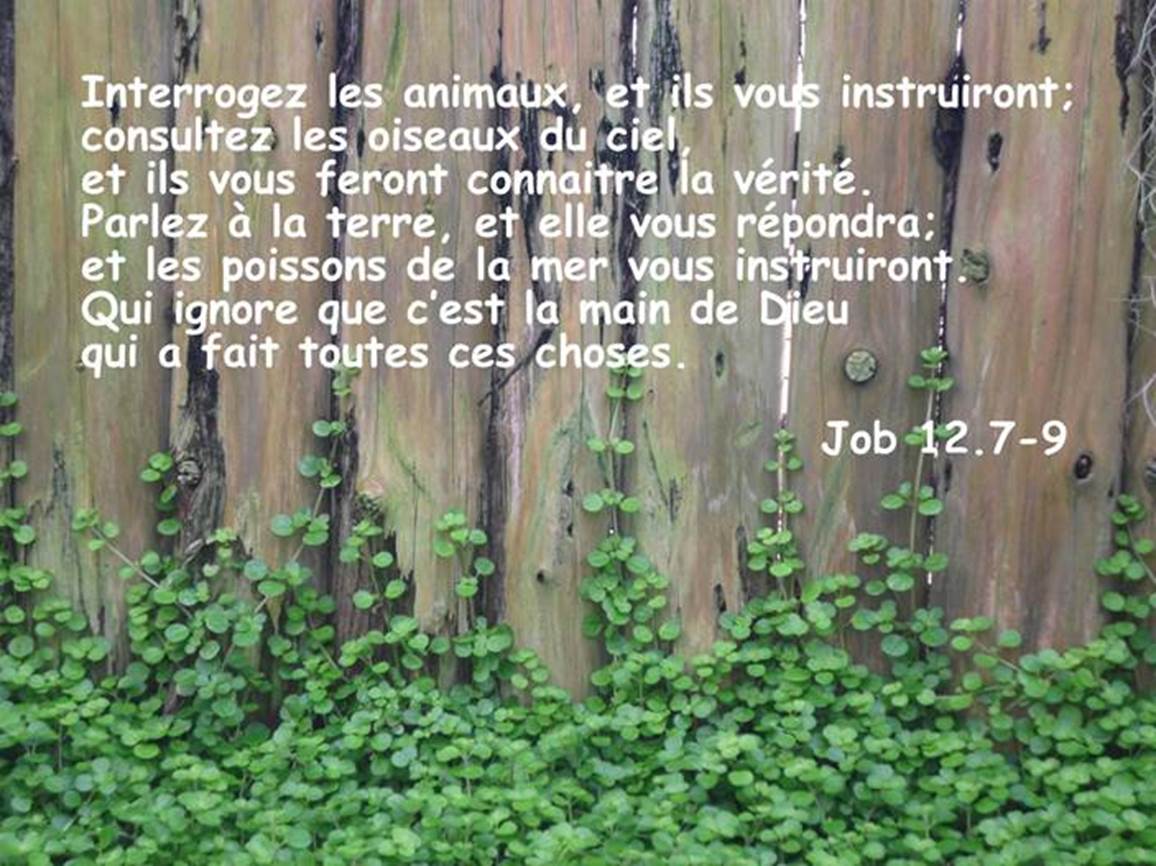 Interrogez les animaux, et ils vous instruiront ; consultez les oiseaux du ciel, et ils vous feront connaitre la vérité. Parlez à la terre, et elle vous répondra ; Et les poissons de la mer vous instruiront. Qui ignore que c’est la main de Dieu qui a fait toutes ces choses ?