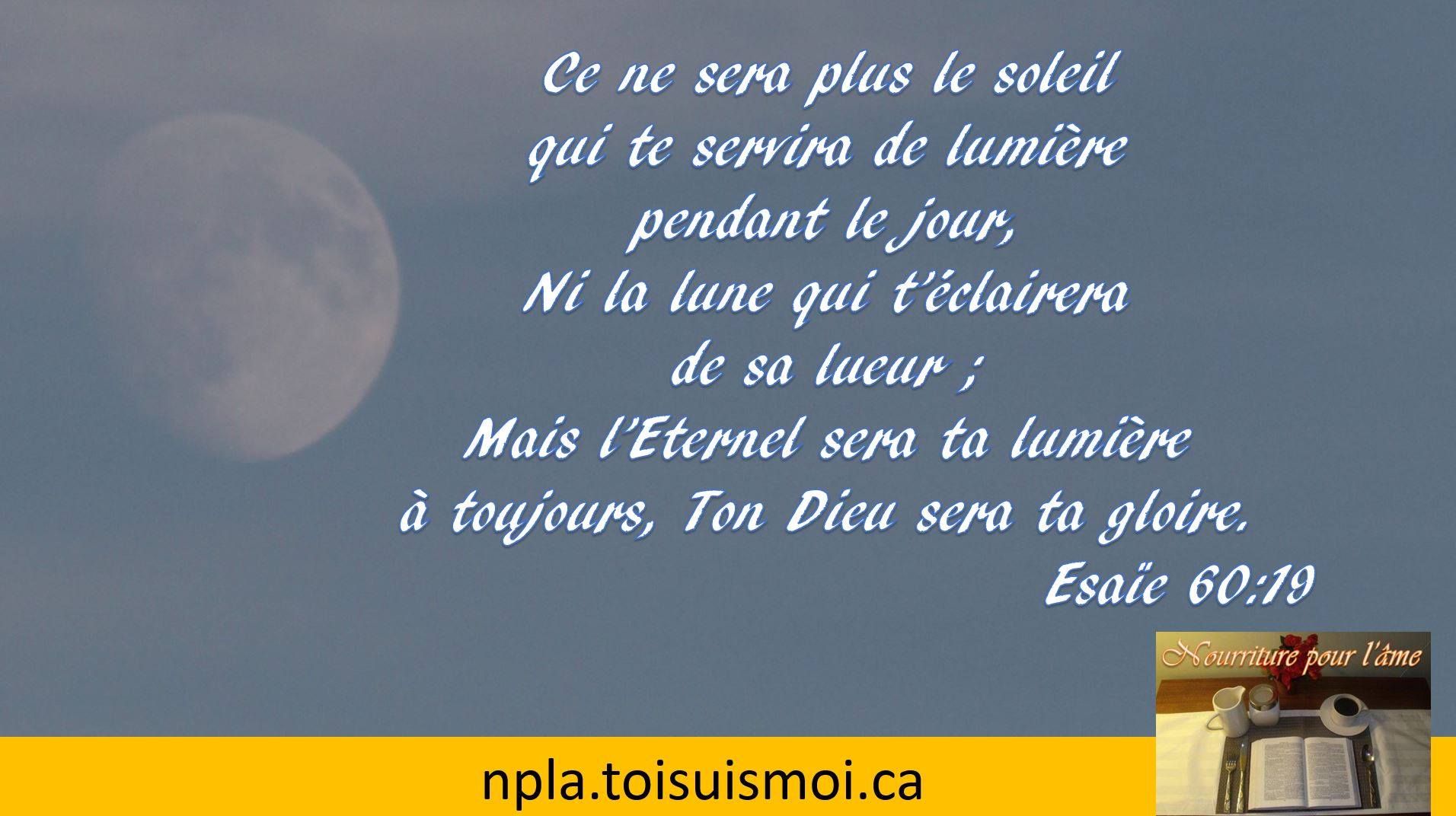 Ésaîe 60.19 Ce ne sera plus le soleil qui te servira de lumière pendant le jour, ni la lune qui t’éclairera de sa lueur ; Mais l’Éternel sera ta lumière à toujours, ton Dieu sera ta gloire.